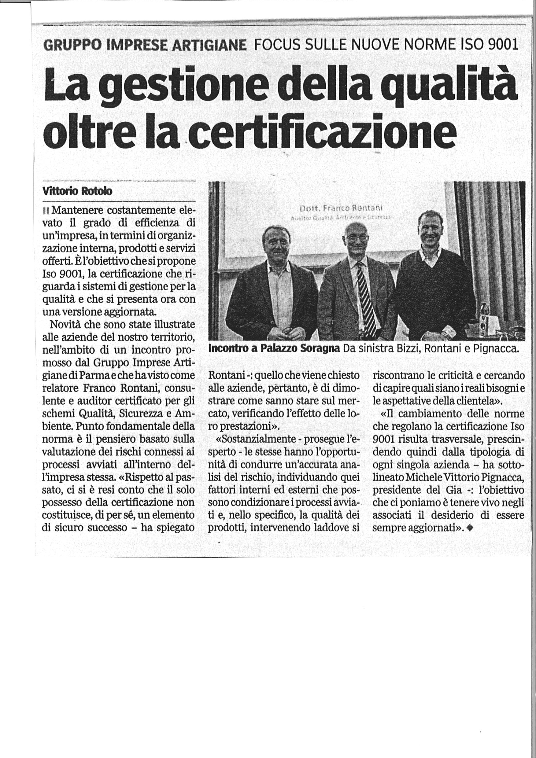 Il nostro consulente, Dott. Franco Rontani ha tenuto un incontro sulla Gestione della Qualità, per spiegare quanto sia importante, avere un sistema di Gestione della Qualità interno, che segue la norma, per mantenere elevato il grado di efficienza di un'impresa.
